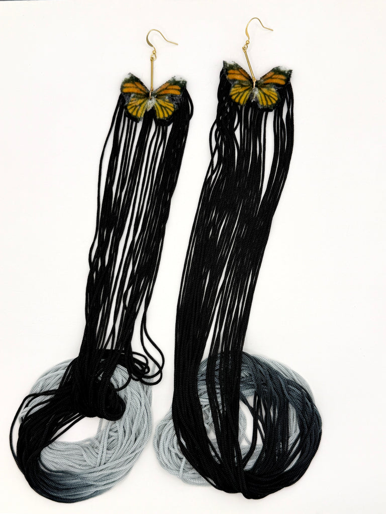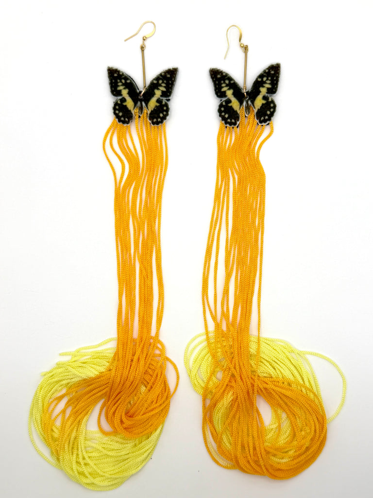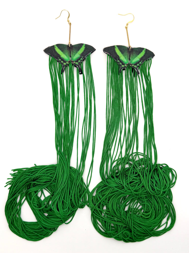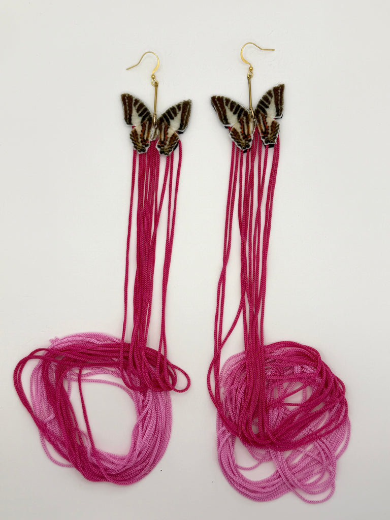 Velvet Butterflies Appliqué  Earrings with 18-24" Fringe. Hardware is gold and gold plated.