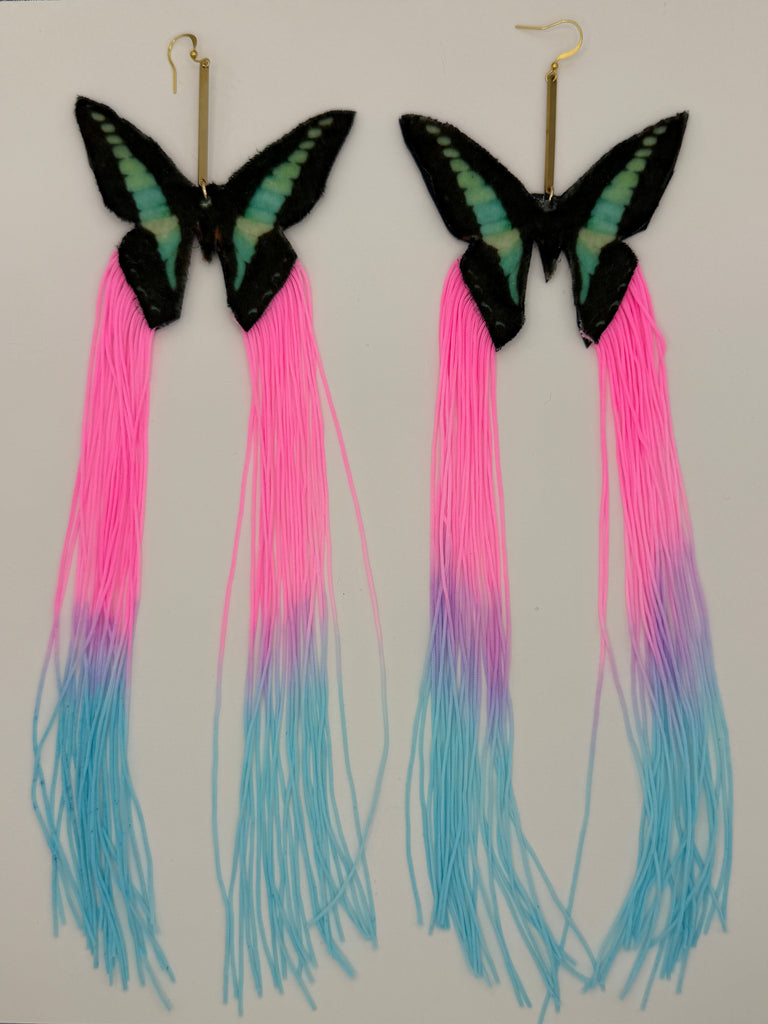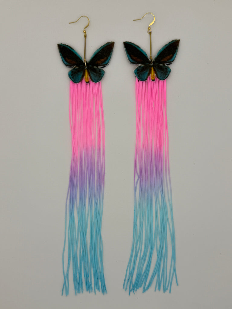 Small Iridescent Blue Butterflies with neon pink and blue 8" Fringe - $45.00