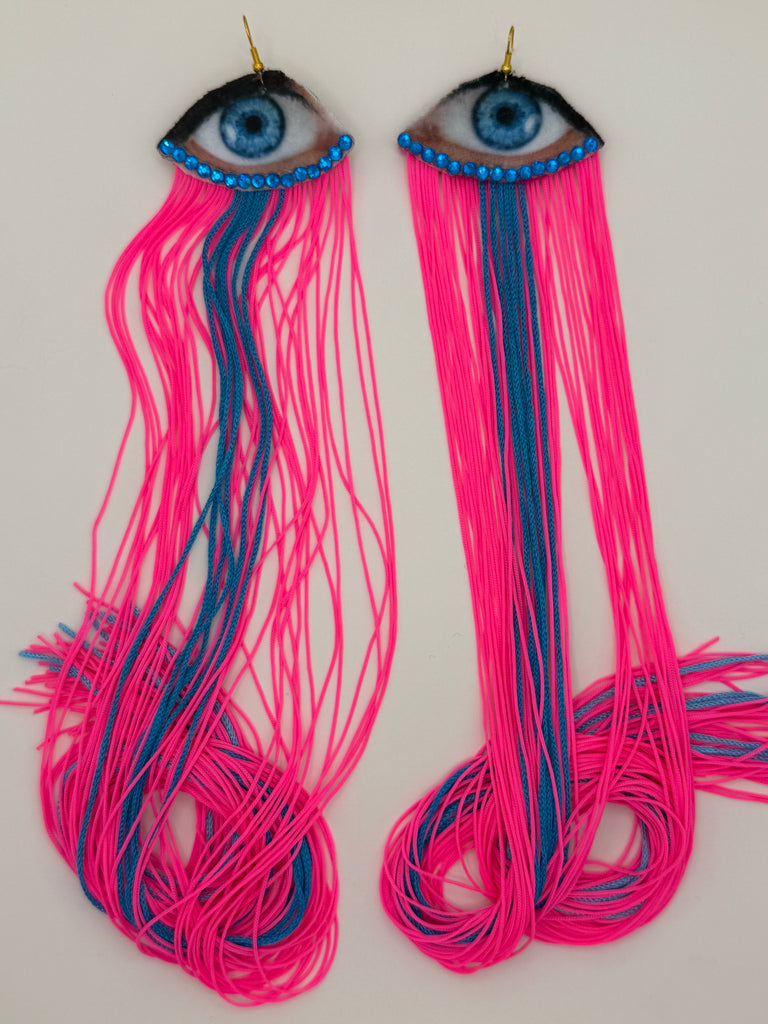 Velvet Eye Earrings with 24" hand dyed fringe and Swarvoski Crystals. Gold and gold plated hardware.