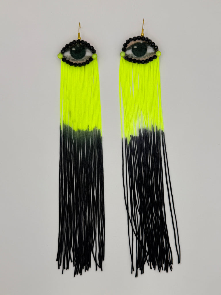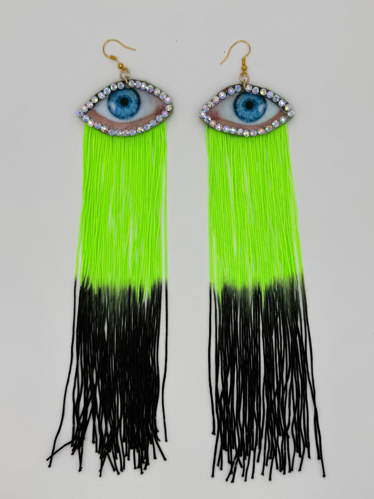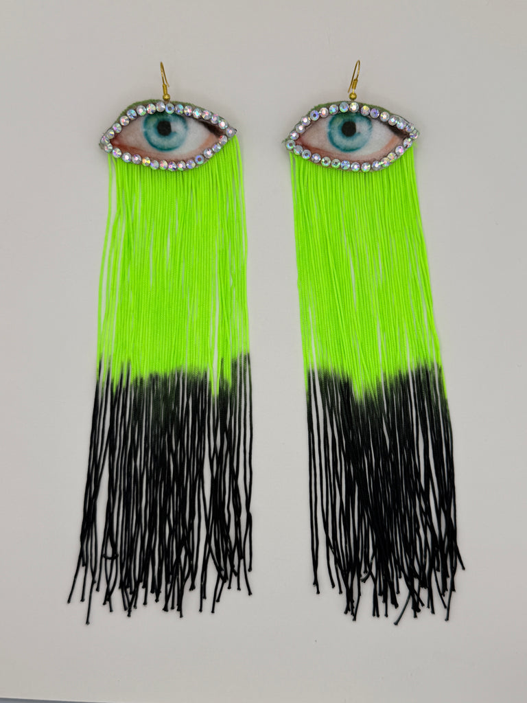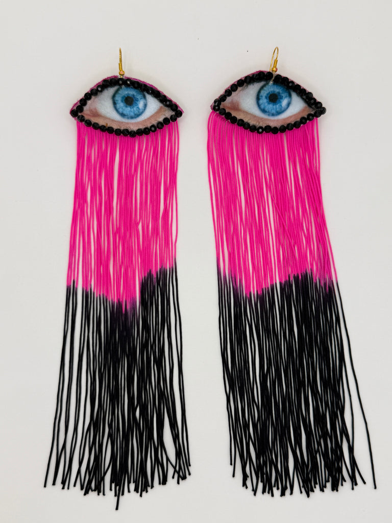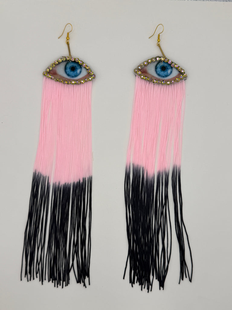 Velvet Eye Artwork Earrings- these earrings have Swarovski crystals surrounding the eyes and 8" hand dyed fringe. Hardware is gold and gold plated.