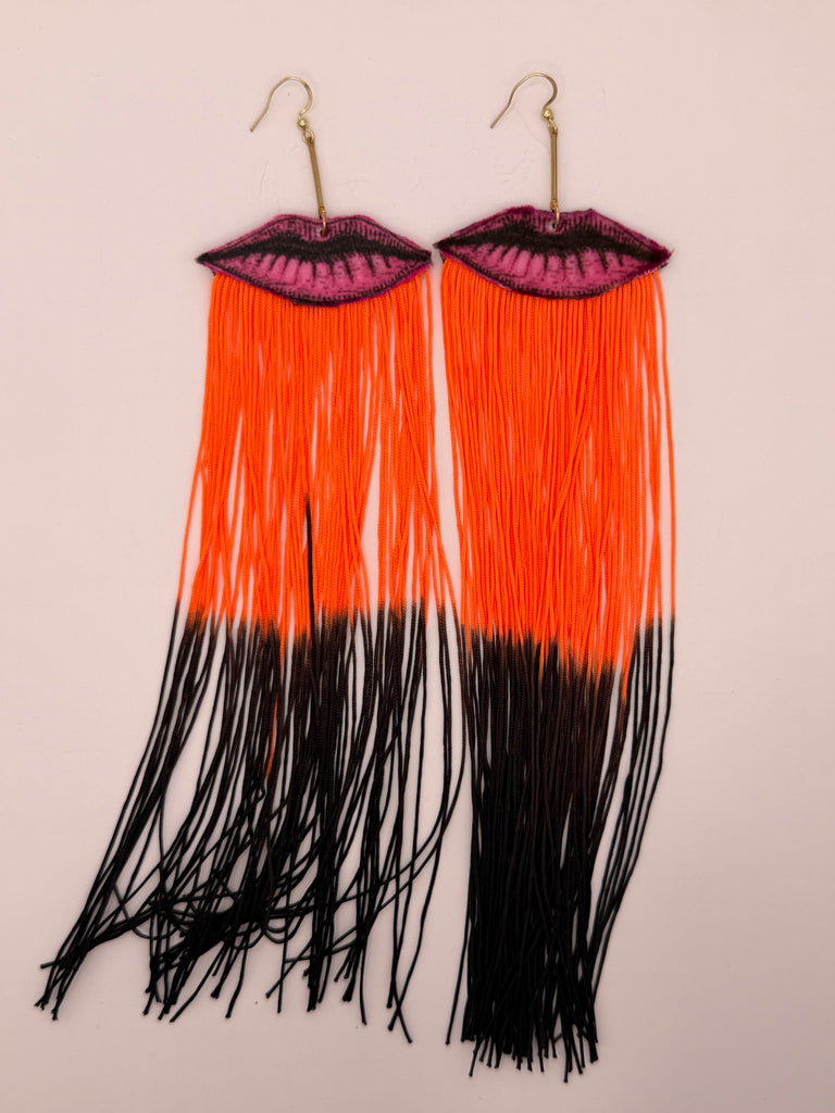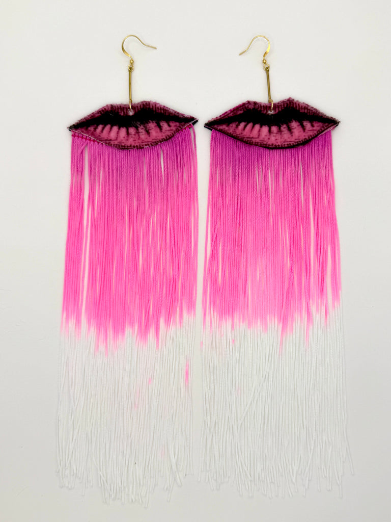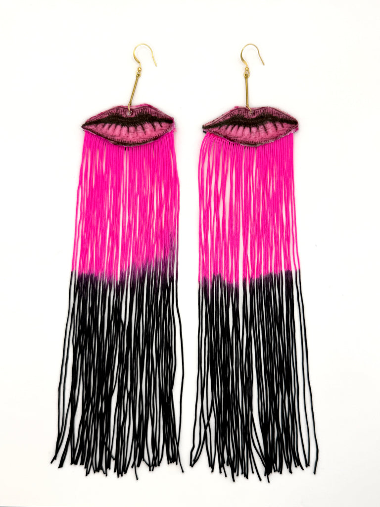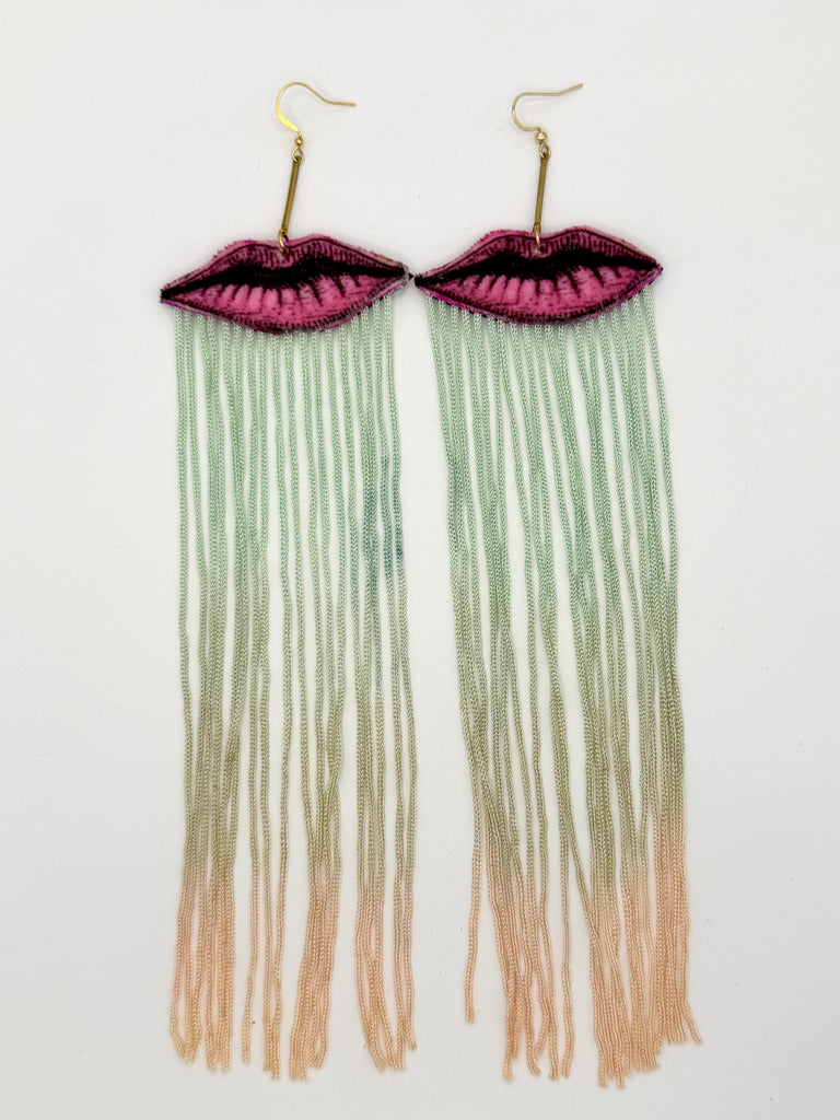 Velvet Lip Earrings with 8" hand dyed Fringe. Hardware is gold and gold plated.