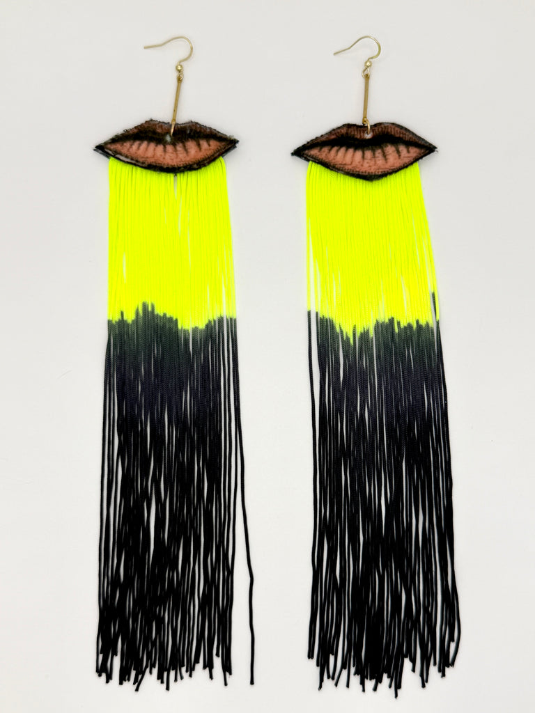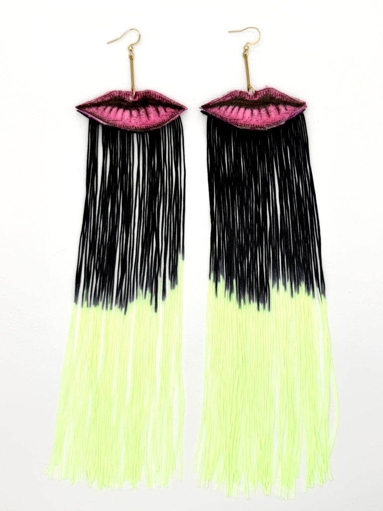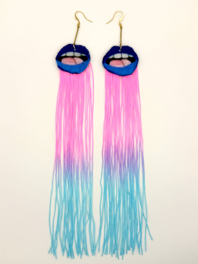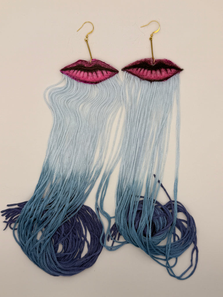 Velvet Lip Earrings with 8" hand dyed Fringe. Hardware is gold and gold plated.